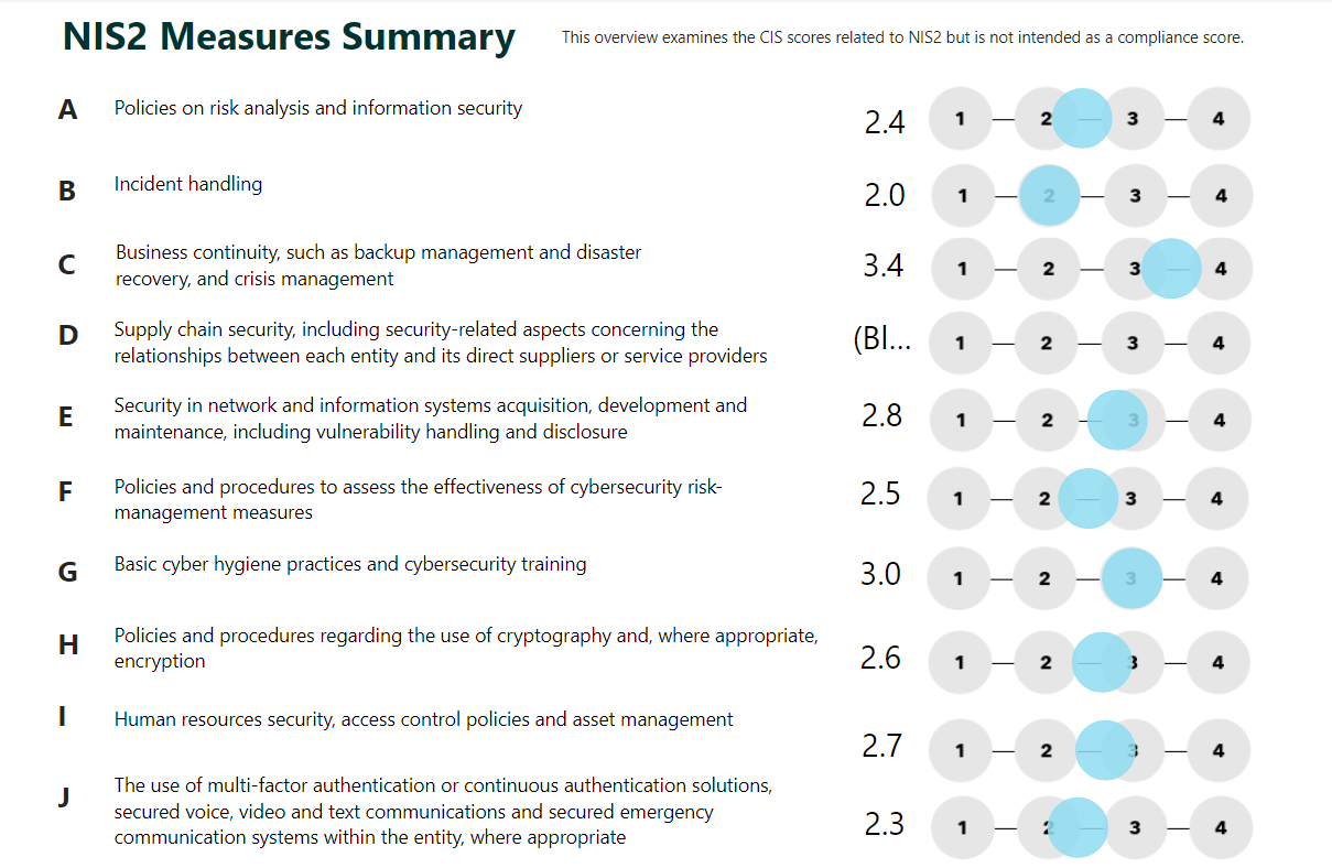 NIS2 includes a dozen so-called ‘Measures.’ Through the built-in mapping of CIS controls to the NIS2 Measures, CSAT provides detailed and rapid insight into your organization’s cybersecurity status and how it aligns with the NIS2 guidelines.